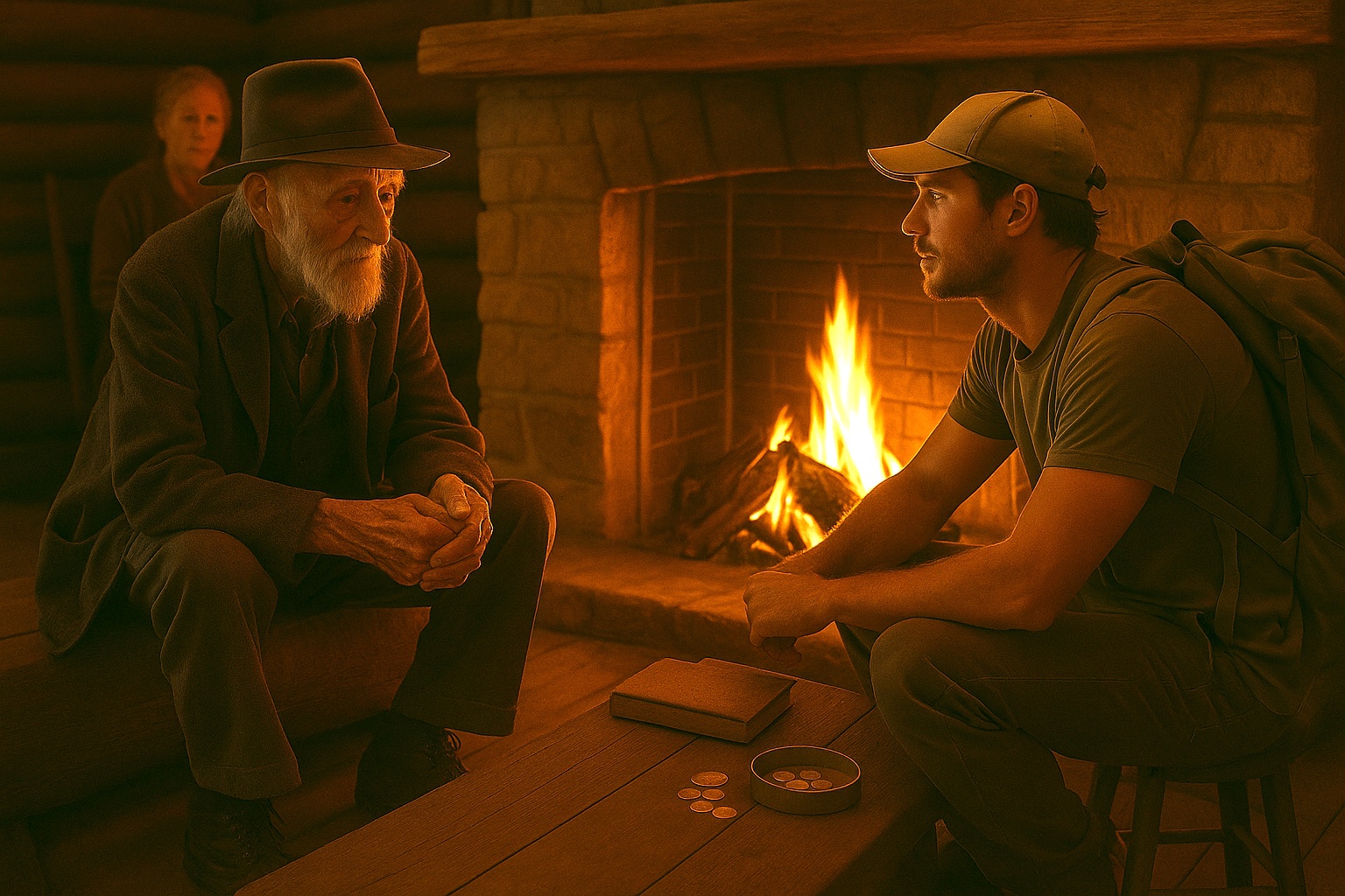 The cabin breathed with evening. A small fire murmured in the hearth, polite and steady. John sat in a chair near the stone, a blanket over his knees. Elmina sat nearby, knitting a quiet that could hold a breaking heart. On the table: a Bible thumbed to softness, the folded homestead papers, and a tin containing coins, buttons, and a feather.