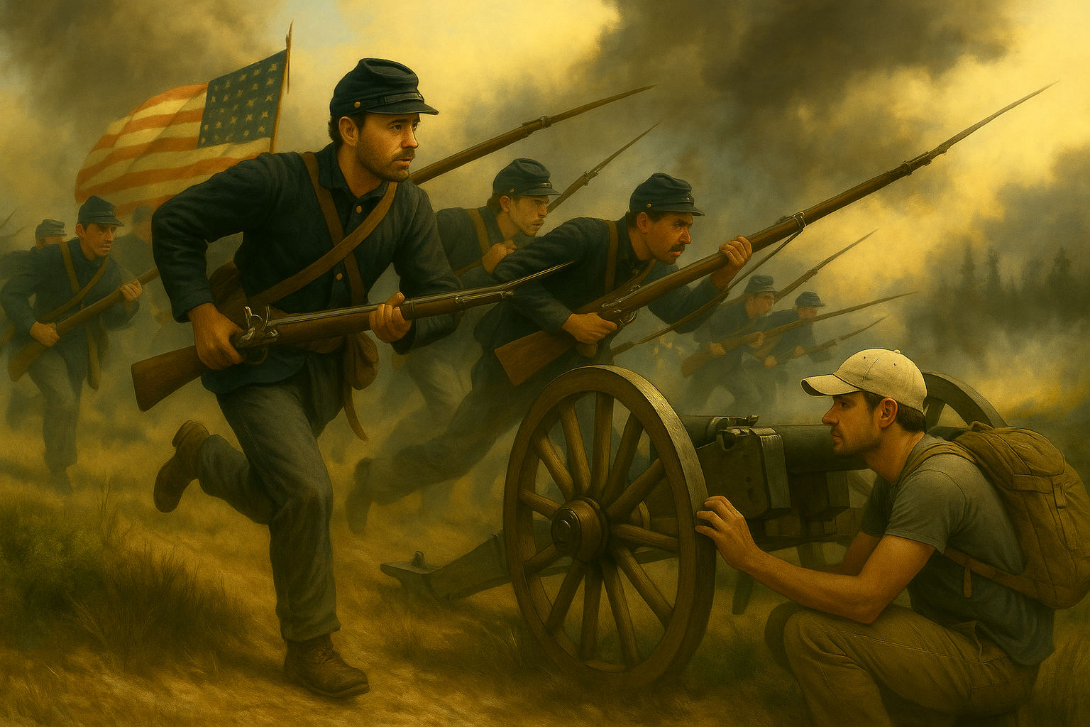 Eli Turner’s to-do list began with fixing the flashing on the outhouse, or otherwise known as the legendary eyesore behind his Pinehaven cabin. He’d hoped for a quiet day to finally catch up, but the outhouse had other plans.The door hung crooked, the crescent moon cutout winked like a conspirator. Some prankster carved the phrase, “TEMPORAL EXPRESS—NO TICKET, NO REFUND” on the door jamb. Eli grinned, tugged the handle, and felt the familiar rush, that stomach-drop you get at the top of a roller coaster and the scent of cold iron and pine sap. The interior darkened to a gold-black spiral and the world fell away. As he stepped out, he found himself in the middle of chaos. Drums hammered, Union troops yelling, boots thundered past, and a shell screamed overhead. The forest was gone. So was his century.